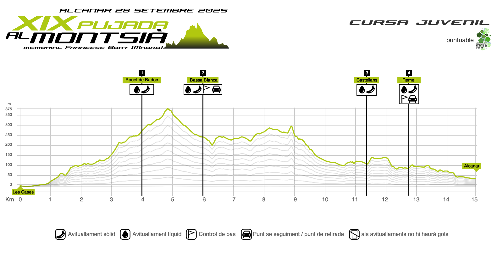 Sortirem del nucli de Les Cases a 0 metres d’altitud sobre el nivell del mar, a la zona de Rocatallada. Creuarem la N-340 per enganxar-nos a la serra de Montsià a través de la serra de la Punta caracteritzada per búnquers, túnels i amagatalls de la Guerra Civil, passant per la cova Calitra. Tot seguit remuntarem fins al lligallo de la Roca Roja passant per llocs emblemàtics com és el jaciment pre-iber dels Sant Jaumes, referent a la Mediterrània. Aquí anirem direcció el pouet de Badoc i tot seguit, després d’un primer descans, començarà la grimpada cap a la Roca Roja per a coronar el primer tram de crestes del Montsià. Quan tinguem a vistes el primer Molló significarà que haurem arribat al punt més alt d’aquest recorregut i ens separarem de l’emblemàtica cresta del Montsià, seguint a l’esquerra per una sendera (Km 5.3) amb una baixada entretinguda que ens portarà fins a la Bassa Blanca (Km 6.7, avituallament) allí ens retrobarem amb el recorregut absolut per a compartir les senderes fins al final. A partir d’aquí s’inicia una lleugera pujada cap als plans de la Cogula i pouet d’Uixan on trobarem una baixada tècnica fins al pal de la Revertera, on trobarem un sender molt divertit, fins a arribar a la pista dels Castellans (Km 11.4, avituallament) on iniciarem un ascens fins a l’Ermita del Remei (Km 12.8, avituallament) on emprendrem l’últim tram de la cursa per la divertida «baixada del gas» que ens portarà fins a una sendera ràpida, per entrar al poble per la plaça del Mirador i baixant per les escales de Sant Miquel (114 escales!!!), endinsant-nos ja pel nucli urbà d’Alcanar fins a l’arribada a la meta.